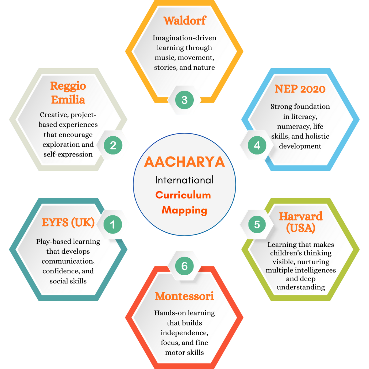 Aacharya curriculum is mapped with EYFS (UK), Waldorf (German), NEP (Indian), Montissori (Italian), Reggio Emilia (Italian) and Project Zero (Harvard-USA). Traditional in name but global in standards.